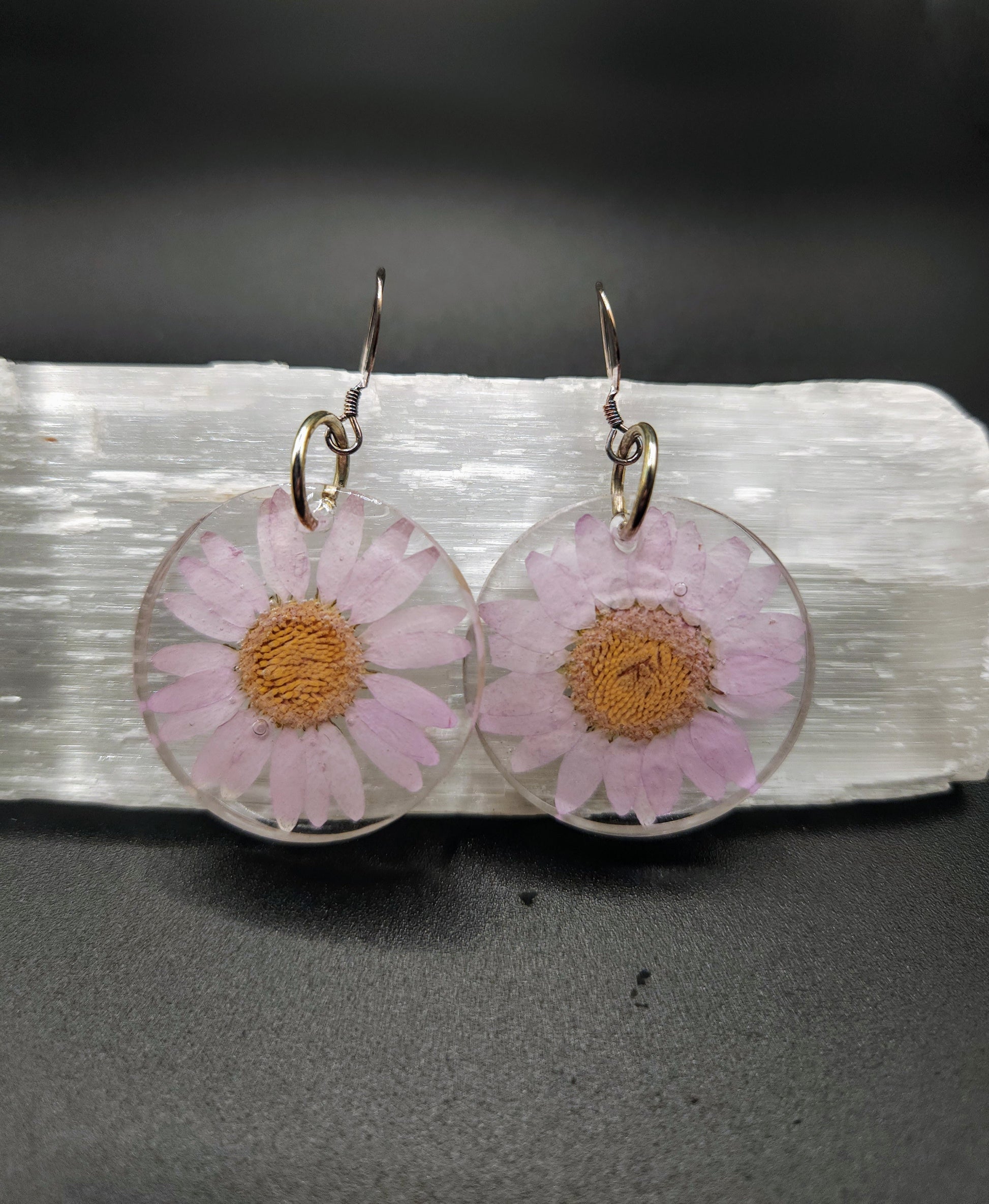 These lightweight earrings feature real daisies, preserved in high quality resin and finished with sterling silver hooks for comfortable wear.